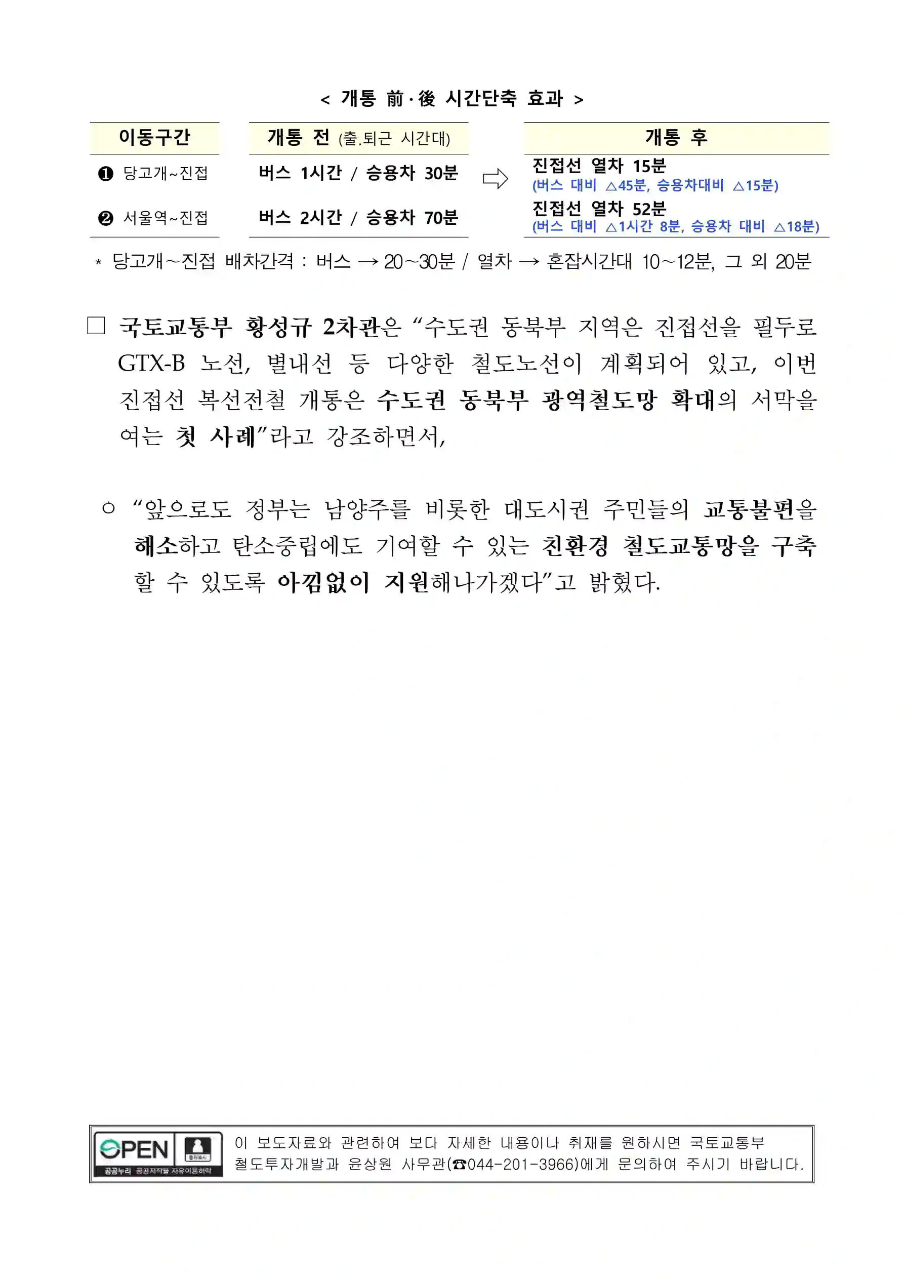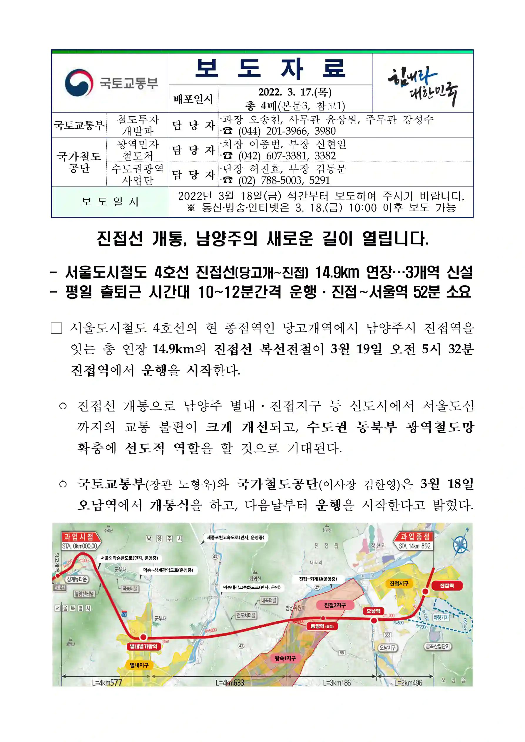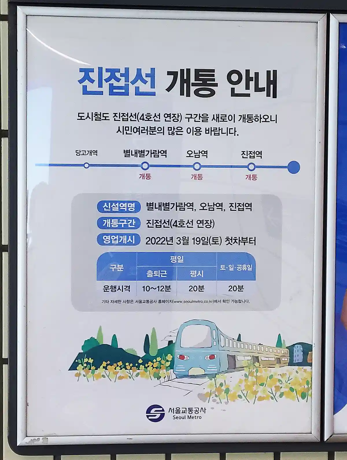 도시철도 진접선(4호선 연장) 개통 안내문 (2022.3) 전철/기타 2025/10/17 12:53 글쓴이 : 팥알 서울교통공사의 4호선 남양주 별내 · 진접 지구로 향하는 연장 구간인 진접선 연장 구간(별내별가람역 - 오남역 - 진접역) 개통 안내문과 보도 자료 입니다. 진접선은 남양주도시공사와 한국철도공사가 운영하고 있습니다. 도시철도 진접선(4호선 연장) 개통 안내문진집선 개통 보도자료 (국토교통부) 1/4진집선 개통 보도자료 (국토교통부) 2/4진집선 개통 보도자료 (국토교통부) 3/4진집선 개통 보도자료 (국토교통부) 4/4