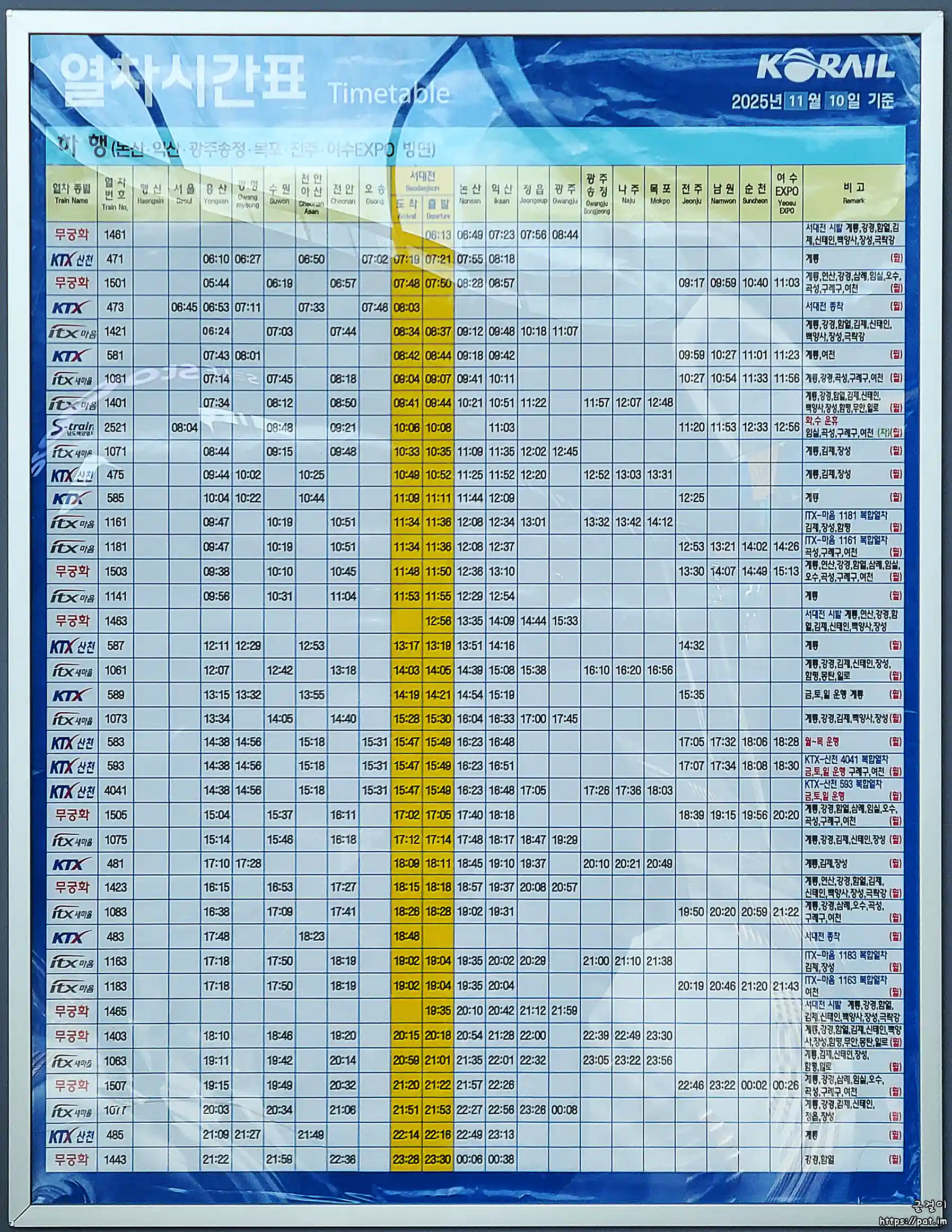 2025년 11월 10일 기준 서대전역의 고속/일반 열차 시간표입니다.