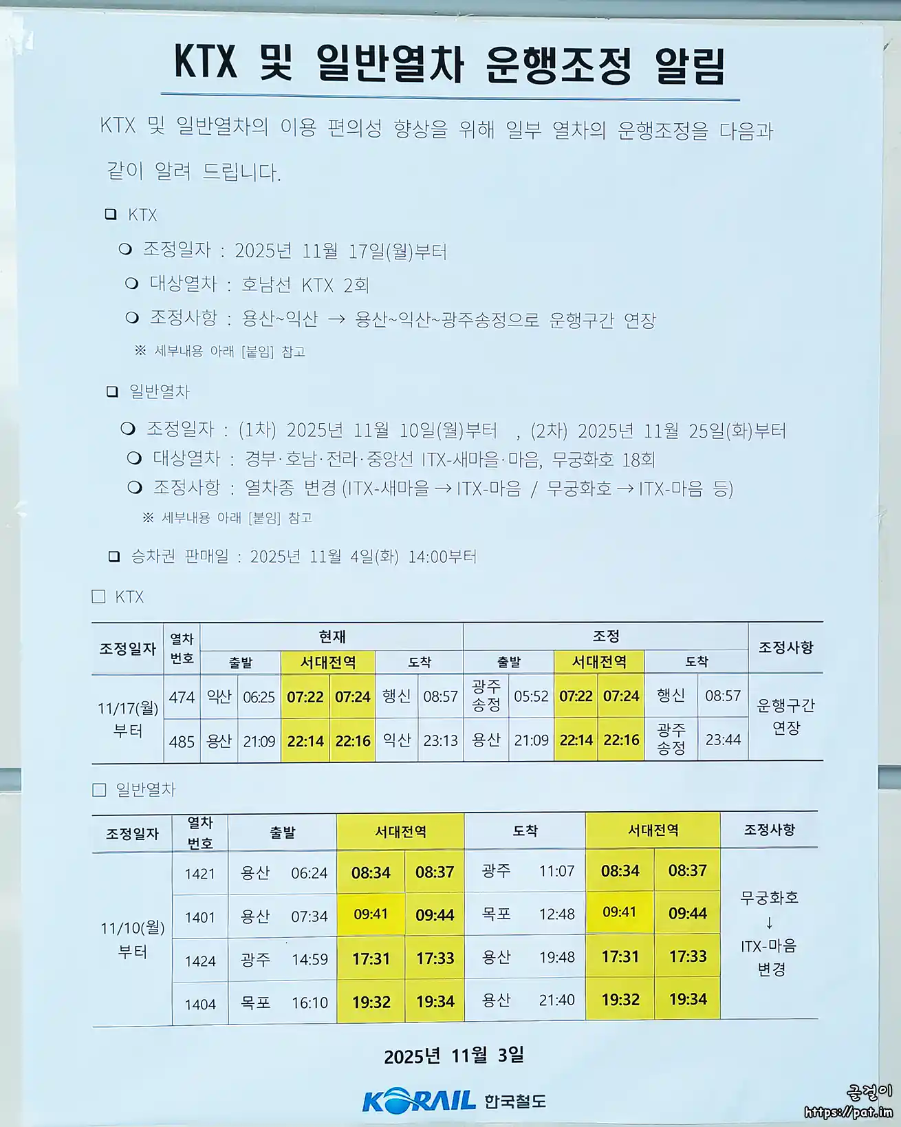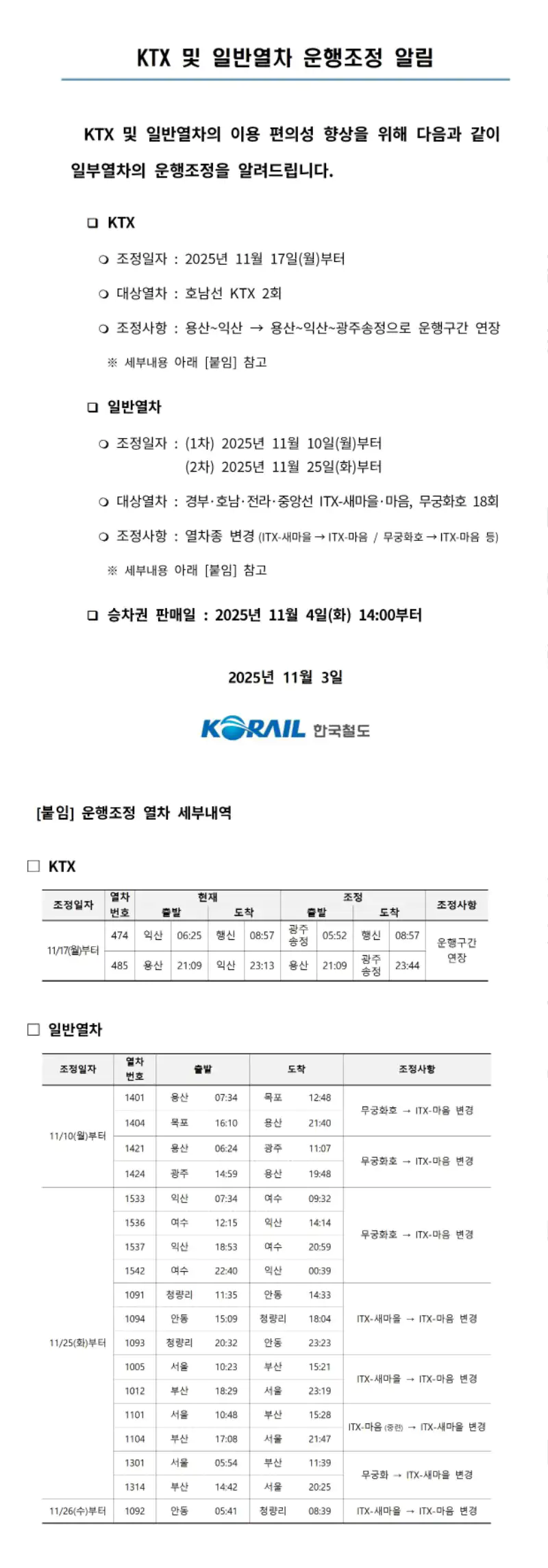 KTX 및 일반열차 운행조정 알림 (2025.11)