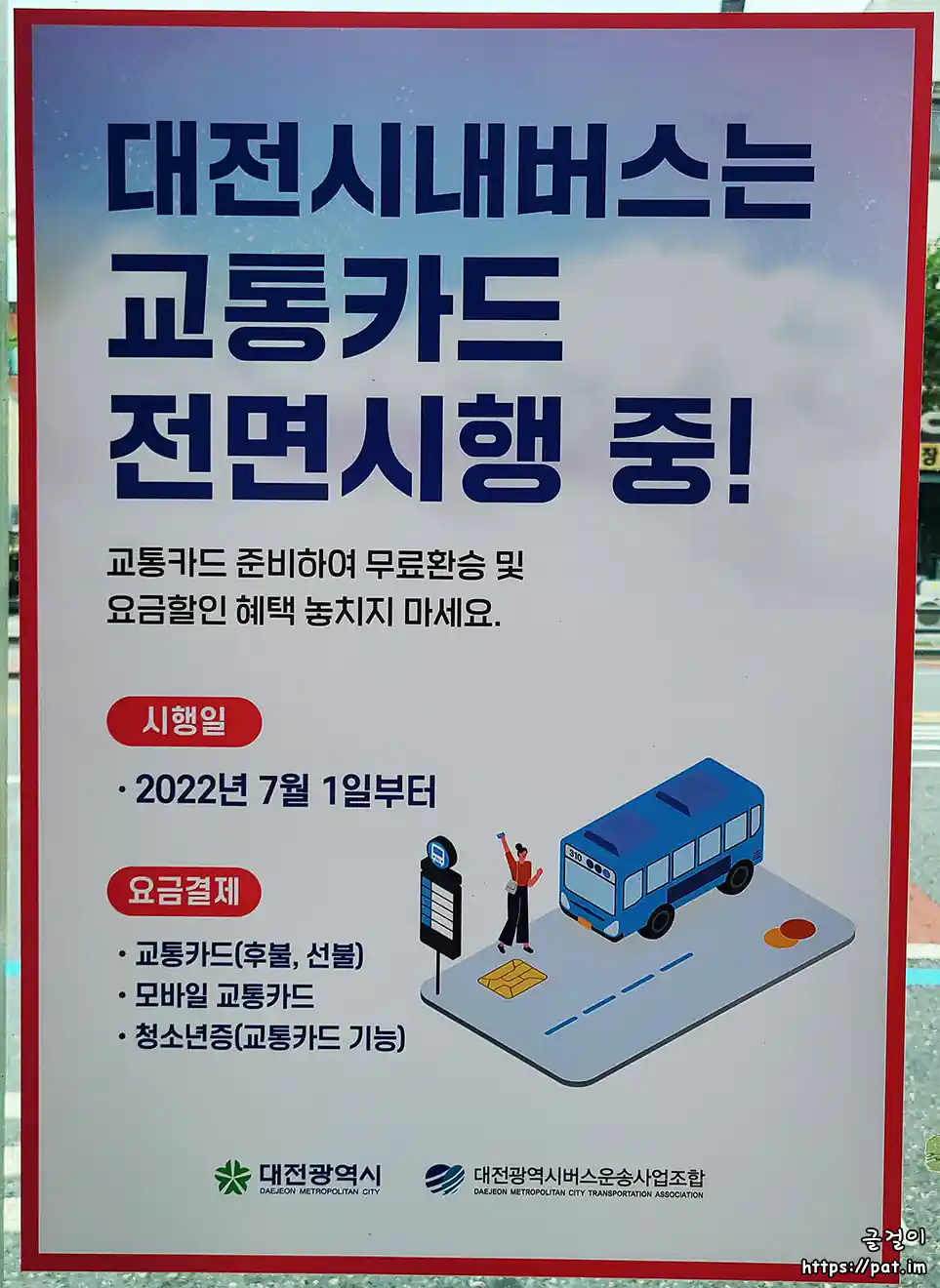 - 교통카드 전면시행(2022.9.1.)에 의하여 대전시내버스(BRT 포함)는 교통카드로 이용