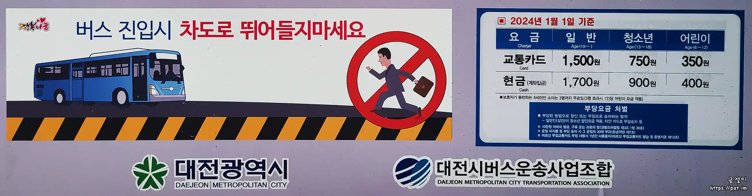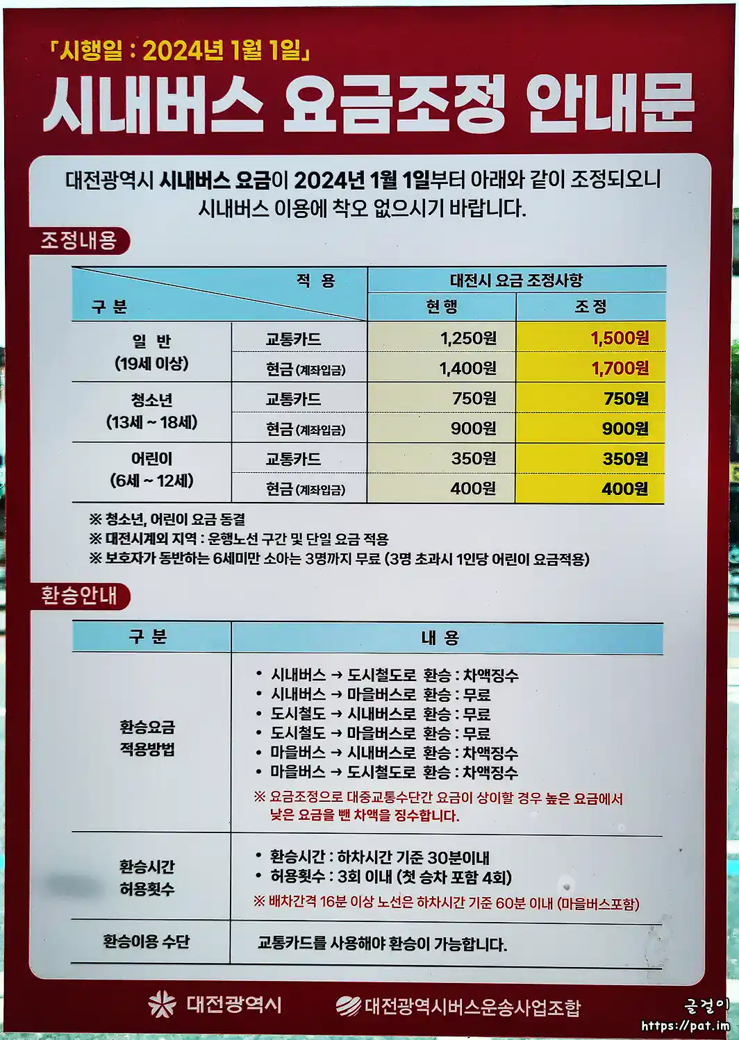 대전 시내버스 요금 안내문 (2024.1.1~)