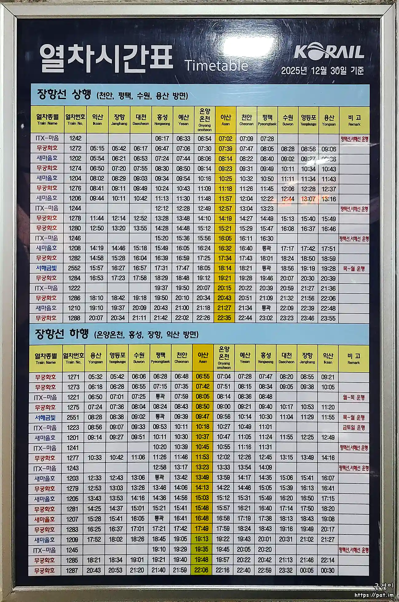 2025년 12월 30일 기준 아산역에서 탈 수 있는 장항선 무궁화호/ITX-마음/새마을호/서해금빛열차(G-train) 시간표입니다.